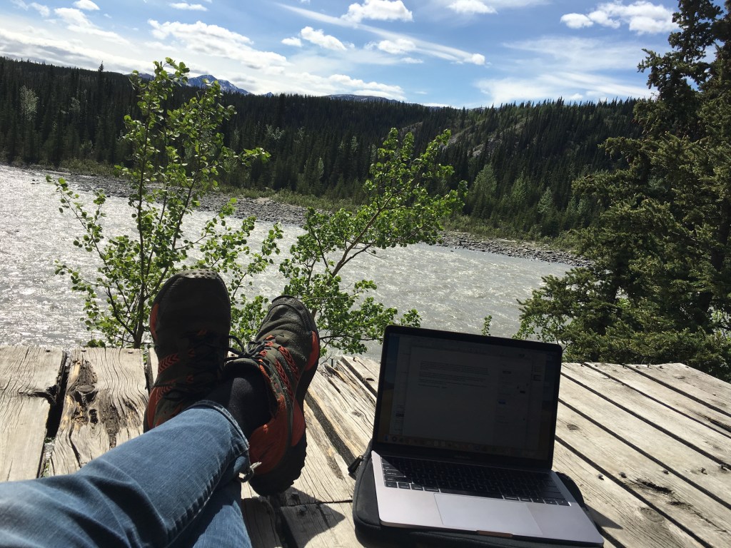 I’m sitting by the Nenana River in Healy, Alaska, just outside Denali National Park. My second season tour directing is underway and I have a couple rare, free afternoon hours on my hands. This spot is out behind the resort where my guests stay. I adore my job (it’s a perfect mix of my talents and interests), but I need to get away from the constant bustle and commotion whenever possible.